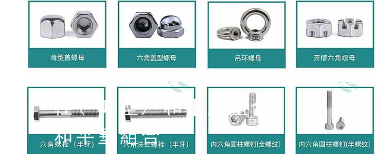 螺栓類:外六角螺栓、外六角法蘭面螺栓、內六角圓柱頭螺栓、吊環螺栓、膨脹螺栓、沉頭內六角螺栓、盤頭內六角螺絲、馬車螺栓、雙頭螺栓、蝶型螺絲、活節螺栓、地腳螺 栓、U型螺栓、四角螺栓等 螺帽類:鉚螺母、吊環螺母、六
