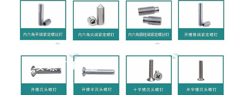 沉頭內(nèi)六角螺釘(平杯)、半圓頭內(nèi)六角螺釘(圓杯)、十字槽盤頭機螺釘、十字槽沉頭機螺釘、十字槽大扁頭機螺釘、十字槽盤頭自攻釘、十字槽沉頭自攻釘、十字槽大扁頭自攻釘、全牙絲桿(牙條)、六角螺母、法蘭 1、頭部形狀頭部形狀各式各樣。有圓頭(半圓頭)、扁圓頭、圓頭凸緣(帶墊)、扁圓頭凸緣(帶墊)、盤頭、盤頭凸緣(帶墊)、沉頭、半沉頭、圓柱頭、球面圓柱頭、喇叭頭、六角頭、六角法蘭頭、六角凸緣(帶墊)頭等。2